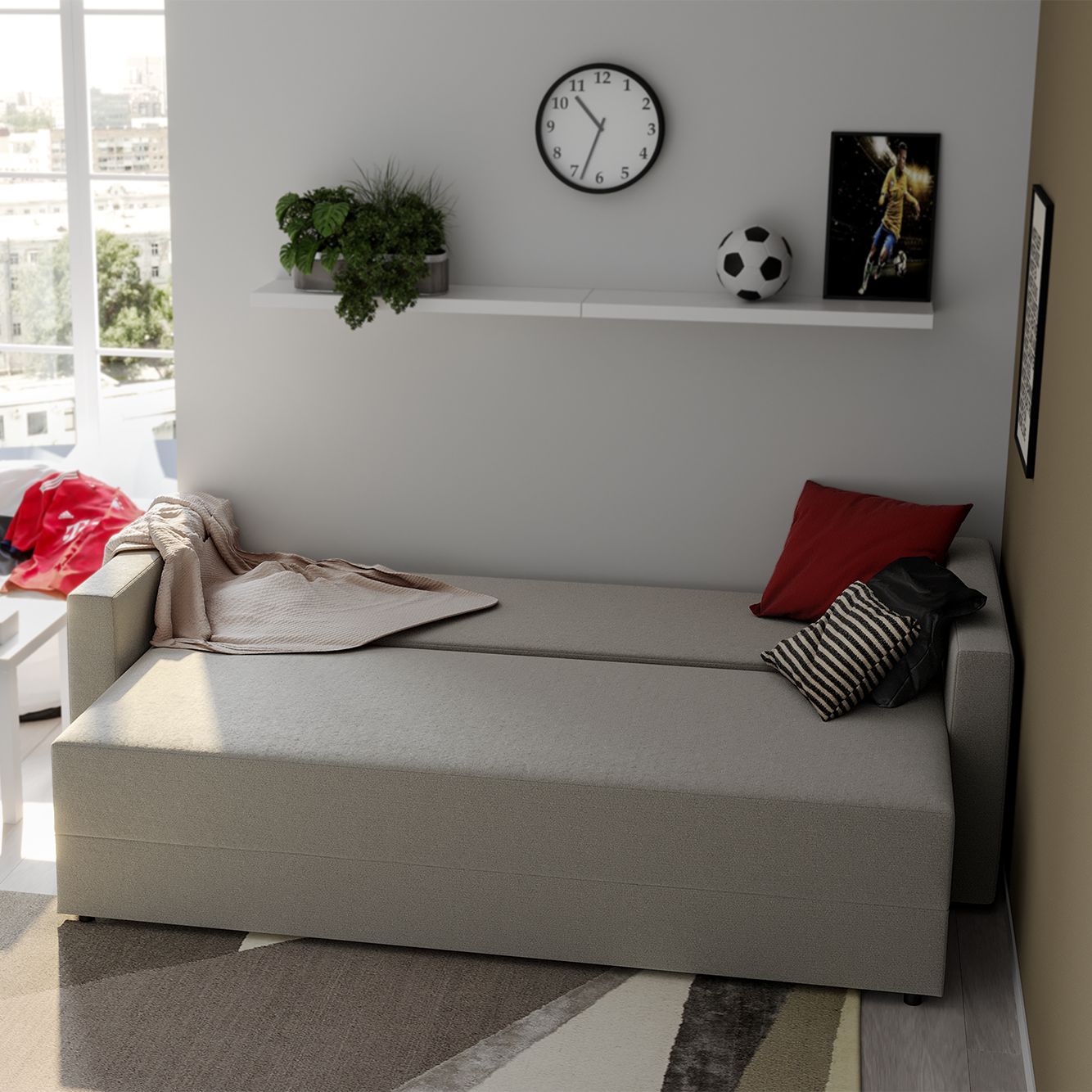 ГУД ЛАКК-новое имя бренда Шведский стандарт! Прямые диваны с подлокотниками раскладного типа с ящиком для белья оптимальны для малогабаритных квартир. Занимают минимум пространства и имеют вместительное место для хранения постельных принадлежностей. Отсек для белья защищает вещи от пыли и загрязнения. МАТЕРИАЛ ОБИВКИ РОГОЖКА • Главное преимущество ткань рогожка – это ее долговечность! Двойное шахматное переплетение делает нити прочными и устойчивыми к истиранию. • Благодаря шахматной структуре плетения нитей свободно пропускает воздух и предотвращает появление грибка и плесени. • Несмотря на свой грубый вид, рогожка мягкая и приятная на ощупь. НАПОЛНИТЕЛЬ ППУ • Наполнитель из пенополиуретана – современный эластичный материал, способный сохранять форму, поэтому нагрузка от веса человека распределяется равномерно. • Пенополиуретан практичен и способен прослужить в течение многих лет, кроме того, такой материал безопасен и экологичен. • ППУ пропускает воздух, поэтому гигиеничен – его легко проветрить и просушить. МАТЕРИАЛ КАРКАСА МАССИВ • Каркас из деревянного массива обеспечивает конструкции устойчивость и долговечность. • Каркасы из массива отличаются экологичностью. МЕХАНИЗМ ТИК-ТАК • Такой механизм трансформации ещё называют пантограф или шагающая еврокнижка. • Это устройство почти не повреждает покрытие пола. • Популярны за счёт компактных габаритов и удобства в использовании. • Простота в использовании. Диван сможет разложить даже ребенок. Наша мебель выполнена в скандинавском стиле, но сможет вписаться и в разнообразные по стилю интерьеры: современный и классический стиль, лофт, минимализм. Качественная, недорогая, красивая, функциональная мебель в любой точке России, Беларуси и других стран СНГ. ГУД ЛАКК-для вашего дома! Поставляется в разобранном виде, со всеми необходимыми комплектующими, инструкцией и схемой по сборке. Габариты изделия: Высота – 78 см; Ширина – 101/142 см; Длина – 227 см. Спальное место: 1400х2000 мм. Глубина сидения (с/без подушек): 61/80 см. Максимальная нагрузка на одно спальное место: 100 кг. Максимальная нагрузка на дно ящика для белья: 5 кг. Вес без упаковки: 90 кг. Ящик для белья под основным сидением, 179х64х23 см. Тип опор – черные ножки высотой 5 см. br/> Каркас мебели: заготовки из массива сосны, фанера, HDF, ЛДСП, литой картон, металлические кронштейны. Матрасный блок: пружинный блок боннель Ø 3,8мм, ППУ марок: Т30150, T20120, T25150. Размер приспинных подушек: 67х46х25 см. Габариты разобранного товара с упаковкой: длина, ширина, высота, мм: 1360х700х380, 2000х790х390, 2000х610х300. Мебель рекомендуется эксплуатировать в помещении с температурой воздуха не ниже +10°С с относительной влажностью 45-70%. Нельзя располагать мебель вблизи отопительных приборов, вплотную к сырым стенам, ставить под прямые солнечные лучи, допускать соприкосновения горячих предметов с мебелью или продолжительного воздействия излучений, вызывающих нагревание поверхности мебели. Температура нагрева элементов мебели не должна превышать +40 °С. Срок службы: 5 лет. Гарантийный срок: 18 месяцев при условии эксплуатации в качестве домашней мебели.