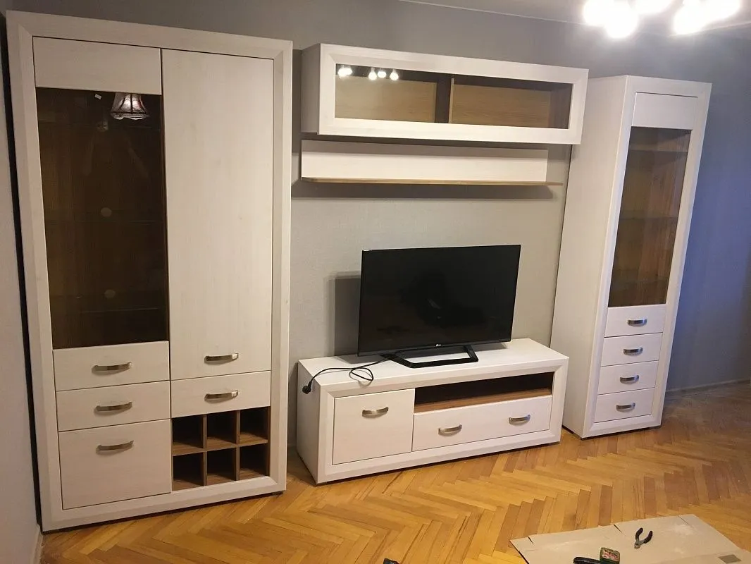 У меня небольшая комната, поэтому мебель я искал светлую и не очень габаритную. Эту гостиную выбрал не сам, а по совету консультанта магазина. Девушка посоветовала этот модульный набор, так как он светлый и состоит лишь из самых необходимых для гостиной предметов мебели. Я уже установил мебель и мне очень понравилось, комната кажется просторнее. Да и сама мебель выглядит не однообразно и не скучно из-за вставок под дерево. Также стоит сказать об отменном качестве мебели.