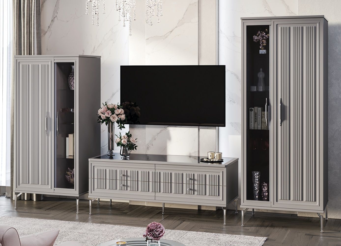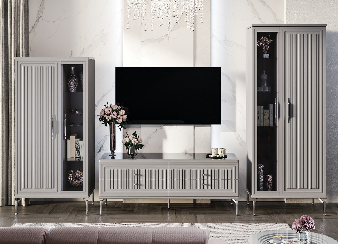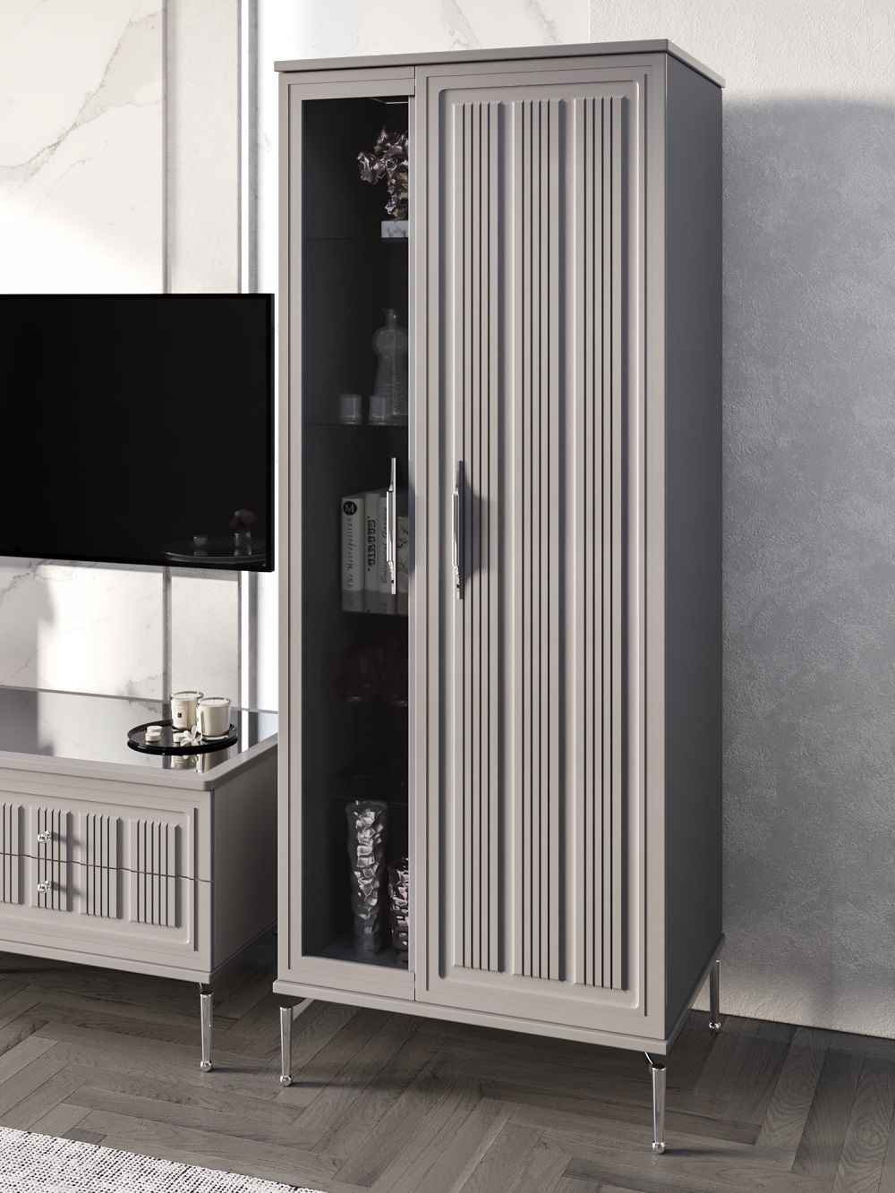 Внутреннее наполнениеШкаф разделен на 2 секции: за щитовой дверью – 3щитовые полки, за дверью со стеклом – 3 стеклянные полки;