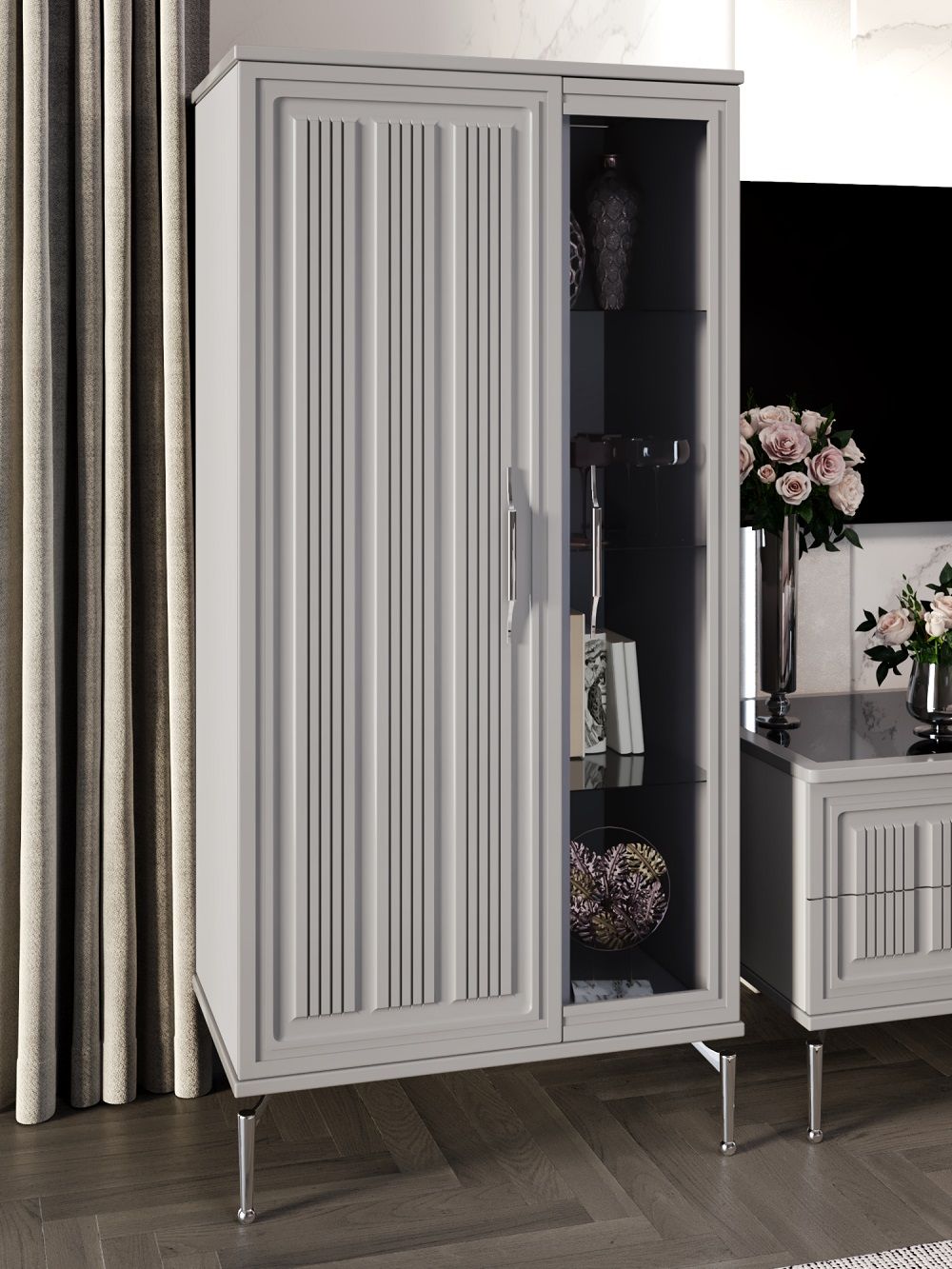 Внутреннее наполнениеШкаф разделен на 2 секции: за щитовой дверью – 4 щитовые полки, за дверью со стеклом – 4 стеклянные полки;