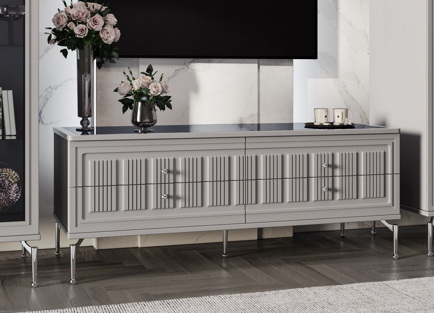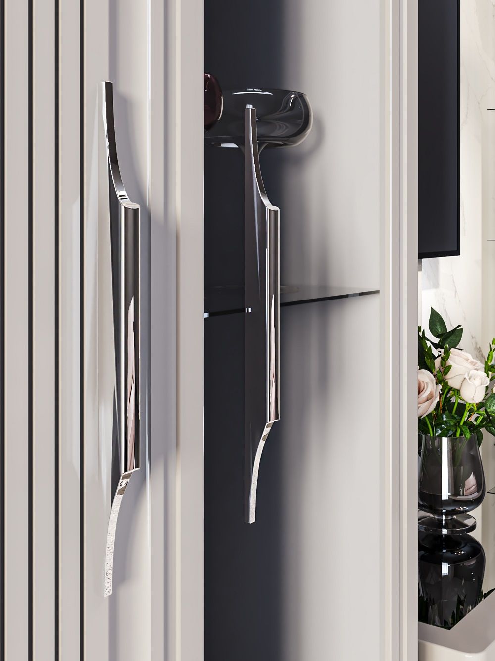 ФасадМДФ с фрезеровкой и вставкой из пластика под латунь/хром + стеклянная дверь с фрезеровкой МДФ;