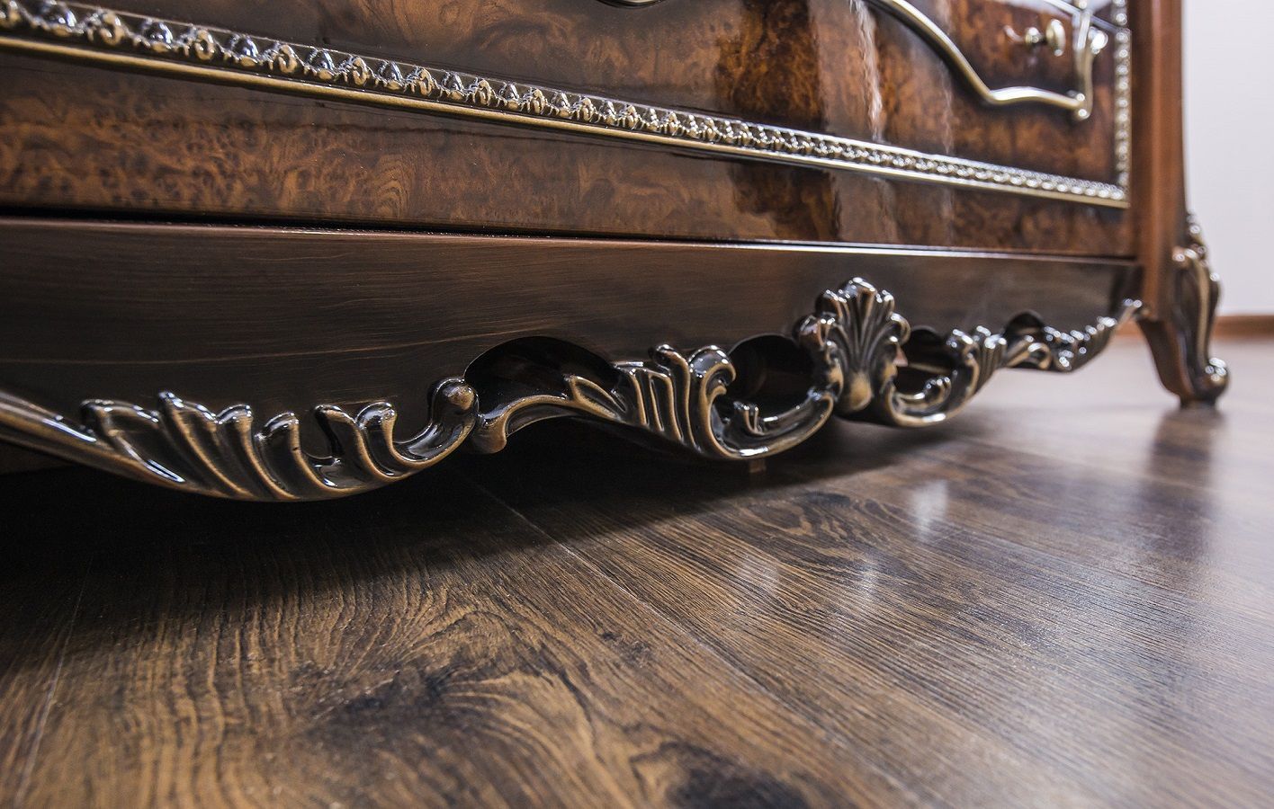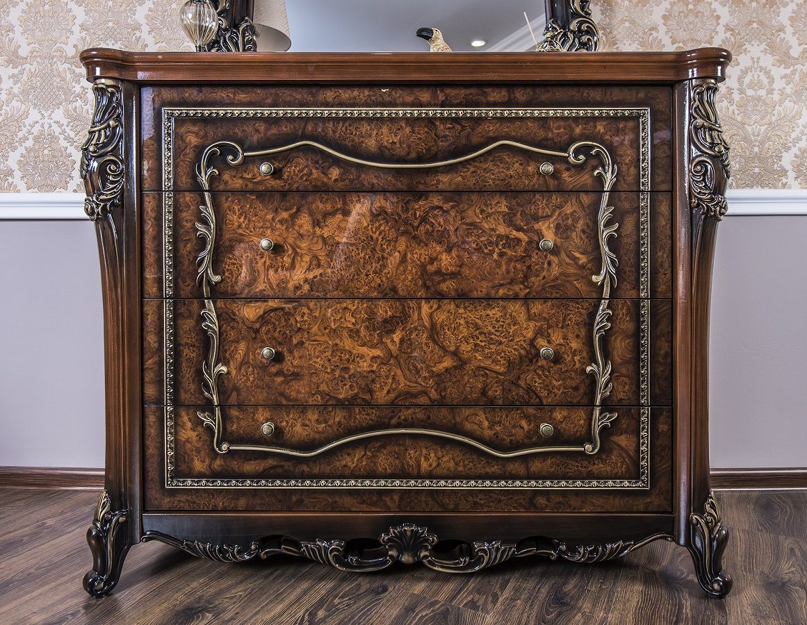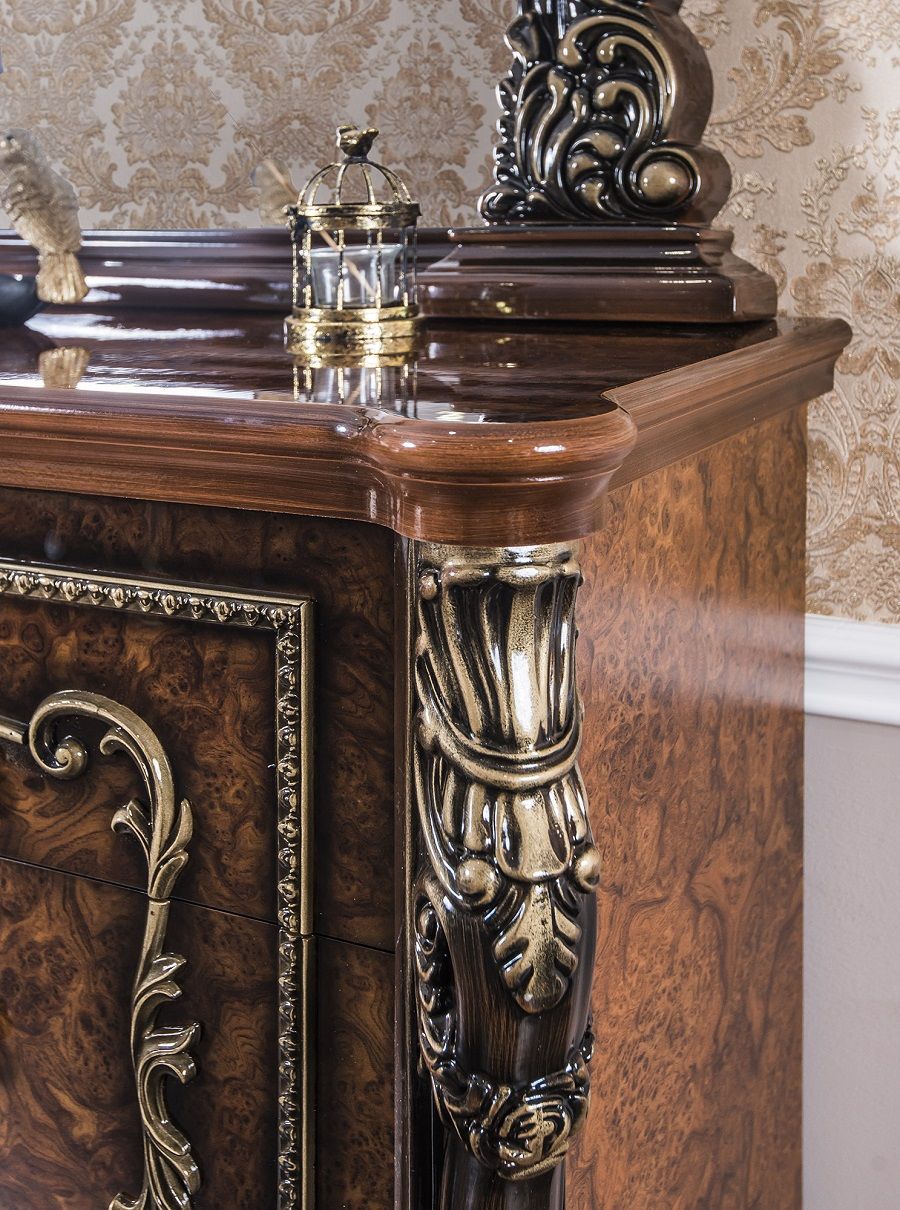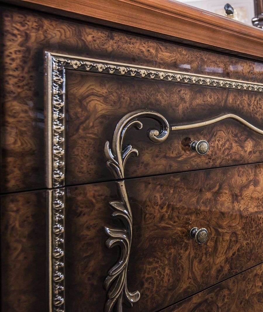 Шикарный комод «Джоконда» в цвете корень дуба глянец – отличный выбор для спальни классического стиля. С первого взгляда эта модель привлекает элегантной фрезеровкой МДФ и богатым декором с эффектом золочения. Такое изделие изготовлено из ЛДСП Kronospan толщиной 16 мм, а при производстве узоров накладок используется облегченный материал премиум сегмента ППУ. Его отличает высокая влагостойкость и ударопрочность.
