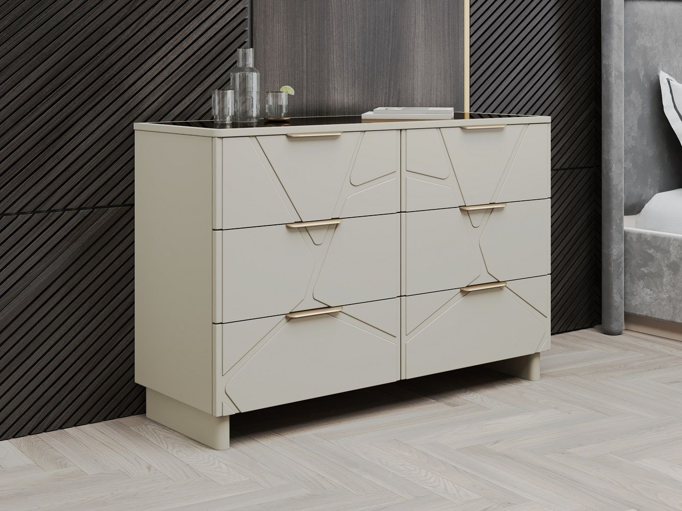 Каждая деталь спальни тщательно продумана, чтобы подарить вам не только максимальный комфорт и эстетическое удовольствие, но и уверенность в высоком качестве мебели. Корпуса и столешницы модулей выполнены из ламинированной древесной плиты европейского качества, Фасады из природного МДФ задекорированы рельефной фрезеровкой и авторский стиль фабрики ЭРА — это финишное покрытие матовая итальянская эмаль ярко серого цвета.