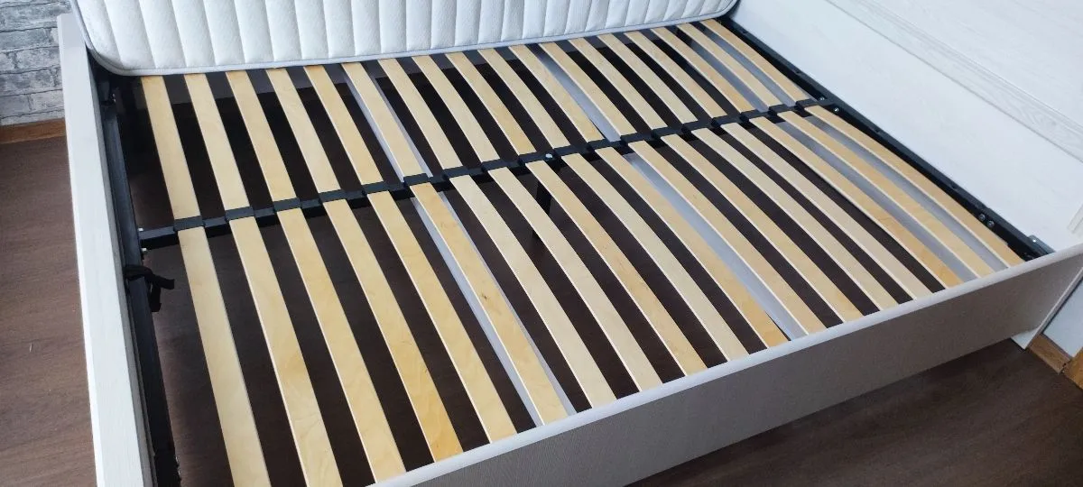 Белорусский производитель Black Red White особое внимание уделил ортопедическим свойствам кровати и установил в ее основании деревянные ламели. Такое реечное дно способствует хорошей вентиляции матраса и не позволит ему сильно прогибаться под весом спящих людей. Максимально допустимая нагрузка на одно место – 120 кг.