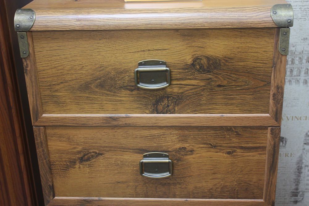 При изготовлении комода Indiana белорусский производитель БРВ-мебель использовал ЛДСП и МДФ. Для отделки торцевых элементов он применил кромочный материал немецкого и австрийского производства. Созданная таким образом мебель приобретает естественный внешний вид с цветом и фактурой дуба саттер. Добавление металлических уголков и ручек в виде подковы придает изделию еще более колоритный вид. Комод «Индиана» ‑ прекрасное дополнение интерьеров в стиле кантри и классика.