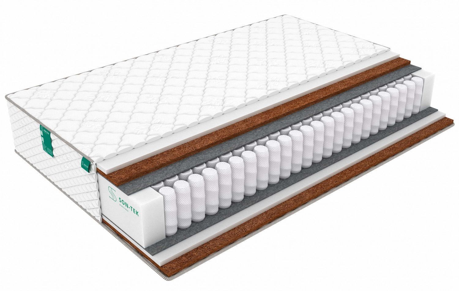 Пружинный матрас, основой которого является блок увеличенной высоты (18 см). В таком блоке каждая пружина воспринимает нагрузку индивидуально, благодаря чему достигается оптимальная поддержка тела. Увеличенная высота пружин обеспечивает точечную подстройку и помогает добиться ортопедичности матраса без использования дополнительных слоев. Пружинный блок данного типа является современным, долговечным и прочным, он не издает шума при нагрузке и не проседает.Блок пружин отделен от наполнителей слоями термовойлока,он защищает их от контакта с пружинами и продлевает срок службы матраса. Наполнитель в данном матрасе комбинированный и состоит из ортопедической пены и койры кокоса. Различие в жесткости поверхностей достигается благодаря разному расположению слоев. Умеренно-мягкая сторона имеет верхнее наполнение из ортопедической пены , упругого материала с мягкими анатомическими свойствами. Умеренно-жесткая сторона сверху проложена кокосовой койрой, придающей ей необходимую жесткость и ортопедические качества. Оба наполнителя хорошо вентилируются, не накапливают пыль и неприятные запахи. По периметру матраса предусмотрено усиление из плотной пены, что продлевает срок эксплуатации матраса. Общая высота модели – 23 см. Максимальная нагрузка – 110 кг. Матрас поставляется в трикотажном чехле, простеганном на объемном холлконе 200 грамм особенность холлкона в том, что его волокна расположены вертикально,это придаёт дополнительный комфорт и стойкость к износу .Такой чехол выглядит более пышно и роскошно в отличие от обычных синтепоновых аналогов.