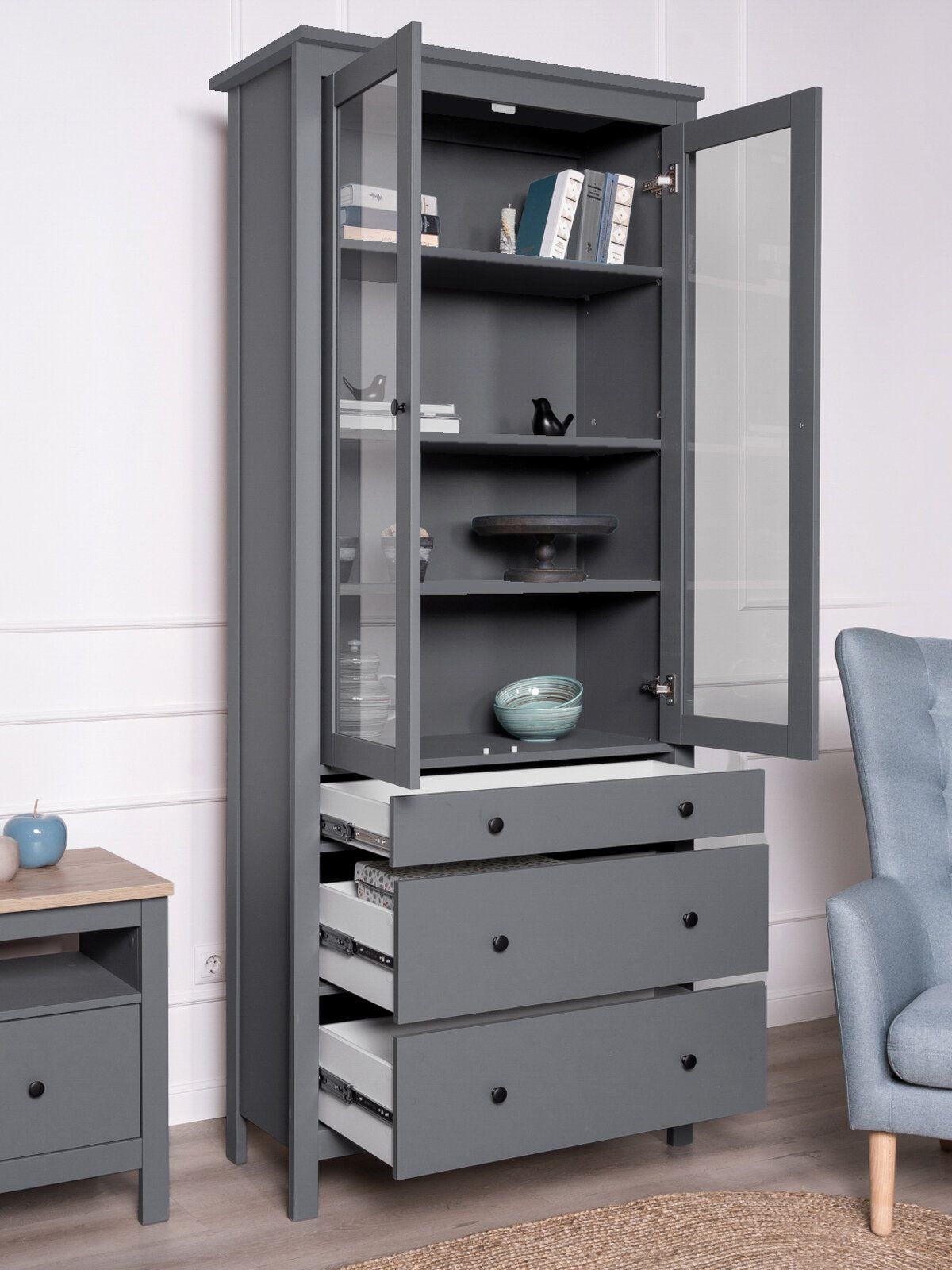 САГА шкаф с витриной 90? Шкаф с витриной САГА — это элегантное и функциональное решение для хранения, которое идеально сочетает в себе стиль, практичность и продуманный дизайн. Стеллаж оснащен тремя вместительными полками, регулирующимися по высоте, что позволяет гибко организовать пространство для хранения книг, посуды, декоративных элементов, фоторамок или других вещей. Дополнительно стеллаж оборудован тремя выдвижными ящиками, которые идеально подходят для хранения тех предметов, которые вы предпочитаете держать вне поля зрения. Ящики оснащены доводчиками и направляющими полного выдвижения, обеспечивающими плавное и бесшумное открывание, а также максимальное удобство в использовании. Благодаря такой продуманной конструкции, вы сможете легко адаптировать стеллаж под свои нужды и поддерживать порядок в доме.
