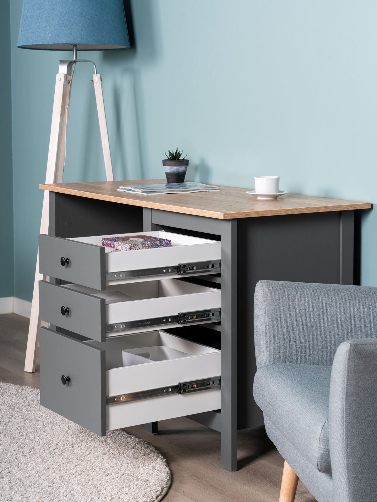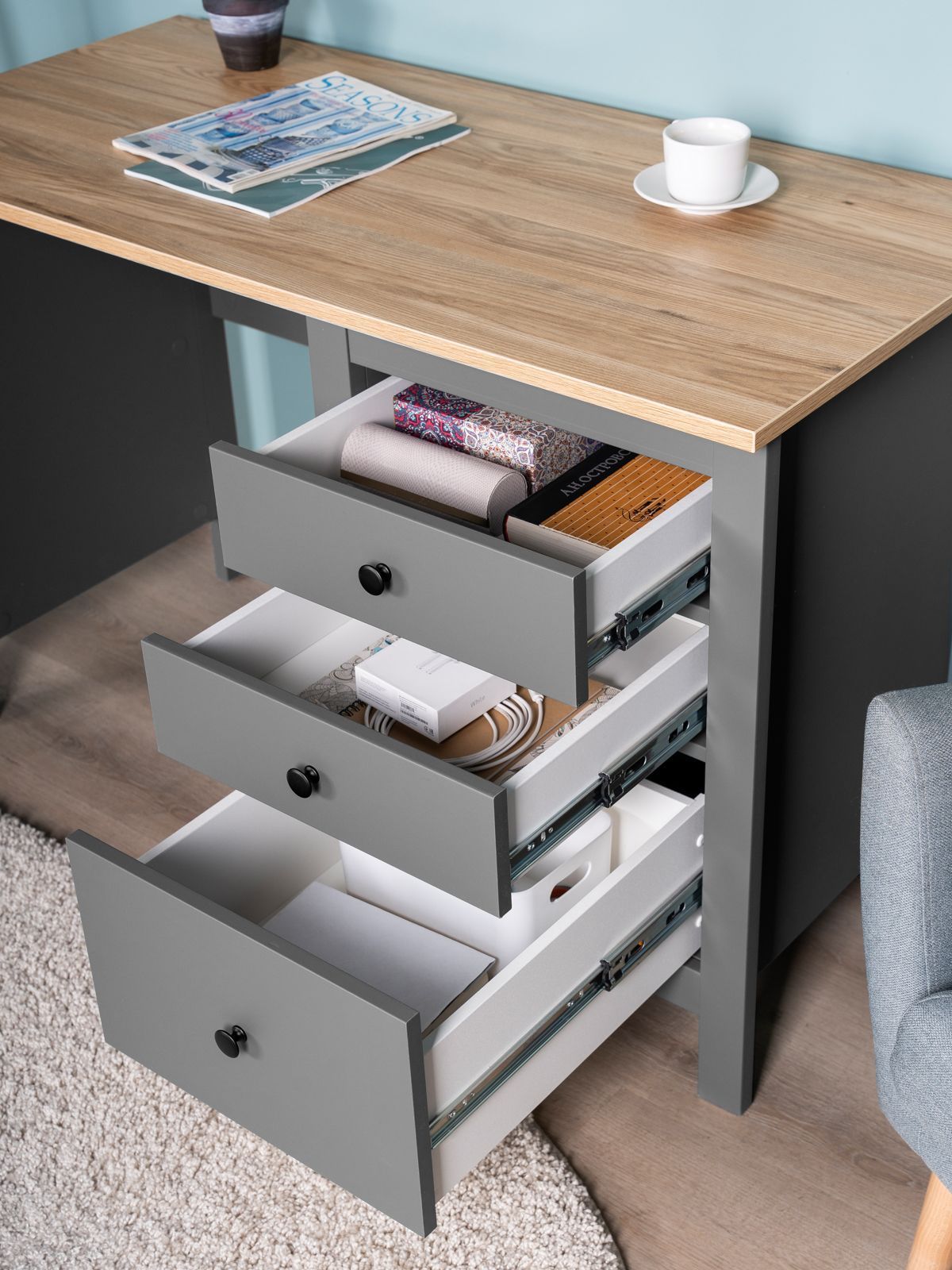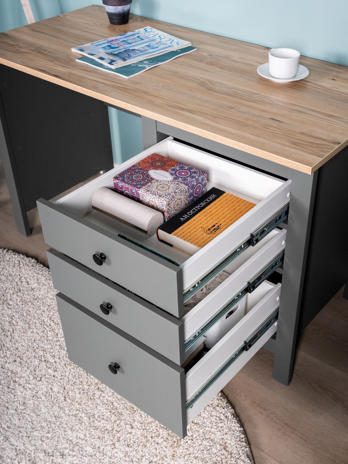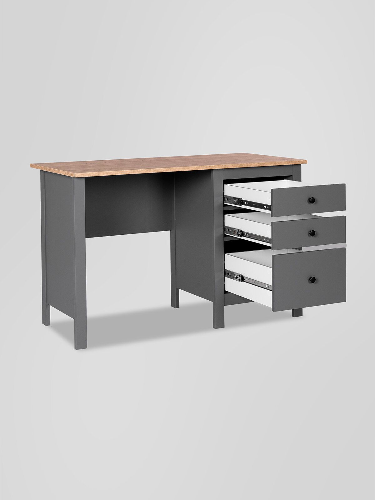 Стол письменный САГА стол письменный, 3 ящика– Идеальное соотношение цены и качества! Серия САГА вдохновлена популярной серией HEMNES от IKEA, и станет идеальным дополнением вашей квартиры. Почему выбирают стол письменный САГА стол письменный, 3 ящика? Письменный стол САГА — это изящное и функциональное решение для организации комфортного рабочего места как дома, так и в офисе. Он сочетает в себе лаконичный дизайн, надежность и продуманную конструкцию, что делает его идеальным выбором для тех, кто ценит практичность, качество и стиль без лишних деталей. Стол оснащен тремя удобными выдвижными ящиками с направляющими полного выдвижения и доводчиками, которые обеспечивают плавное и бесшумное открывание. Эти ящики предназначены для хранения канцелярии, документов, учебников и других мелочей, которые всегда должны быть под рукой. Такое решение помогает поддерживать порядок и организованность, создавая комфортные условия для работы или учебы. Несущие элементы стола выполнены из МДФ, что гарантирует его долговечность и устойчивость даже при интенсивном использовании. Пространство под столешницей позволяет удобно расположить ноги, а сама столешница предоставляет достаточно места для работы с документами, ноутбуком или другими необходимыми предметами. Благодаря своей универсальности и нейтральному дизайну, стол САГА легко впишется в любое пространство — будь то домашний кабинет, детская комната или офис Письменный стол САГА — это не просто мебель, а продуманное рабочее пространство, которое помогает сосредоточиться, вдохновляет на продуктивность и поддерживает порядок. Это идеальный выбор для тех, кто стремится к гармонии между стилем, комфортом и практичностью.