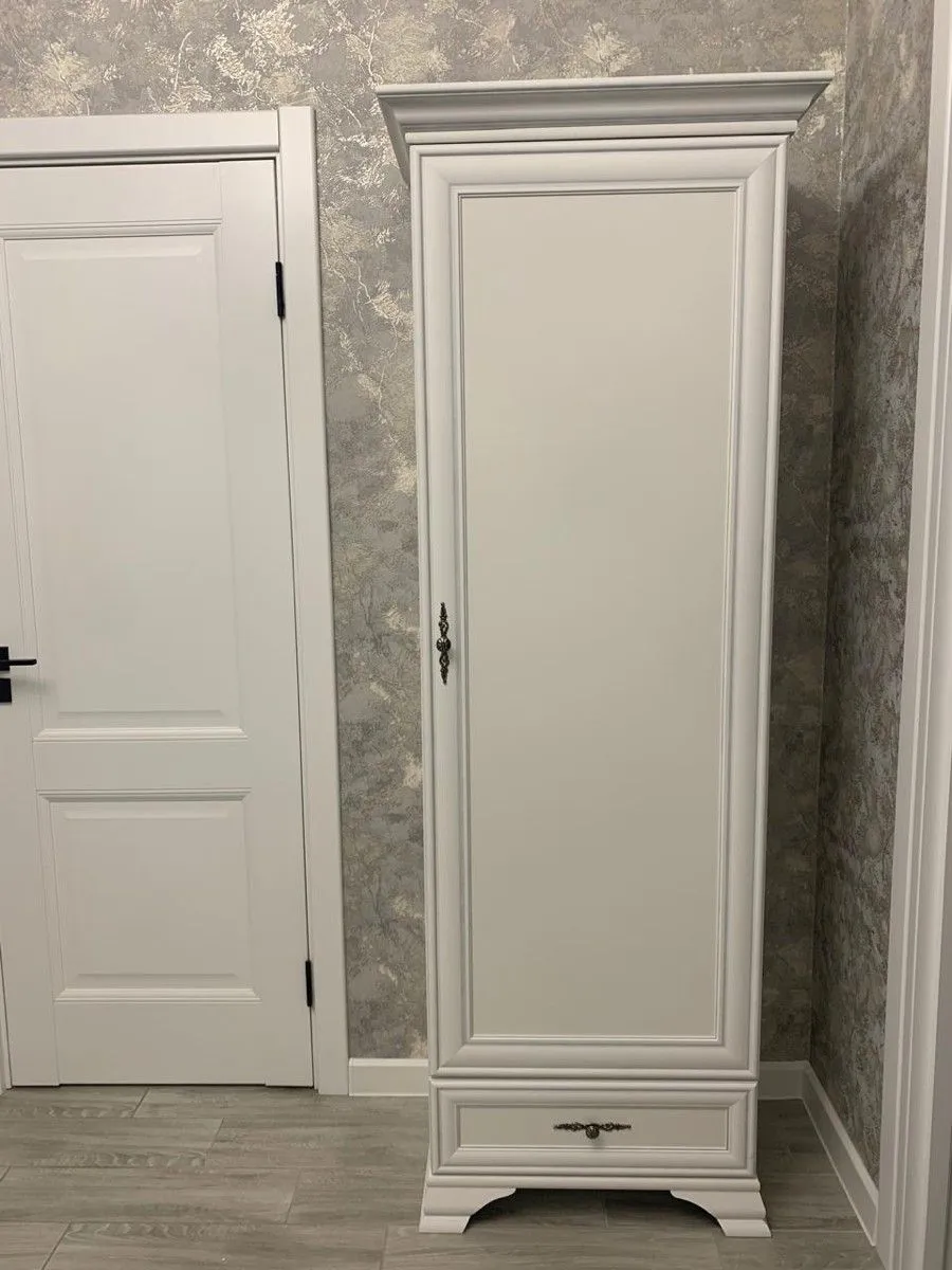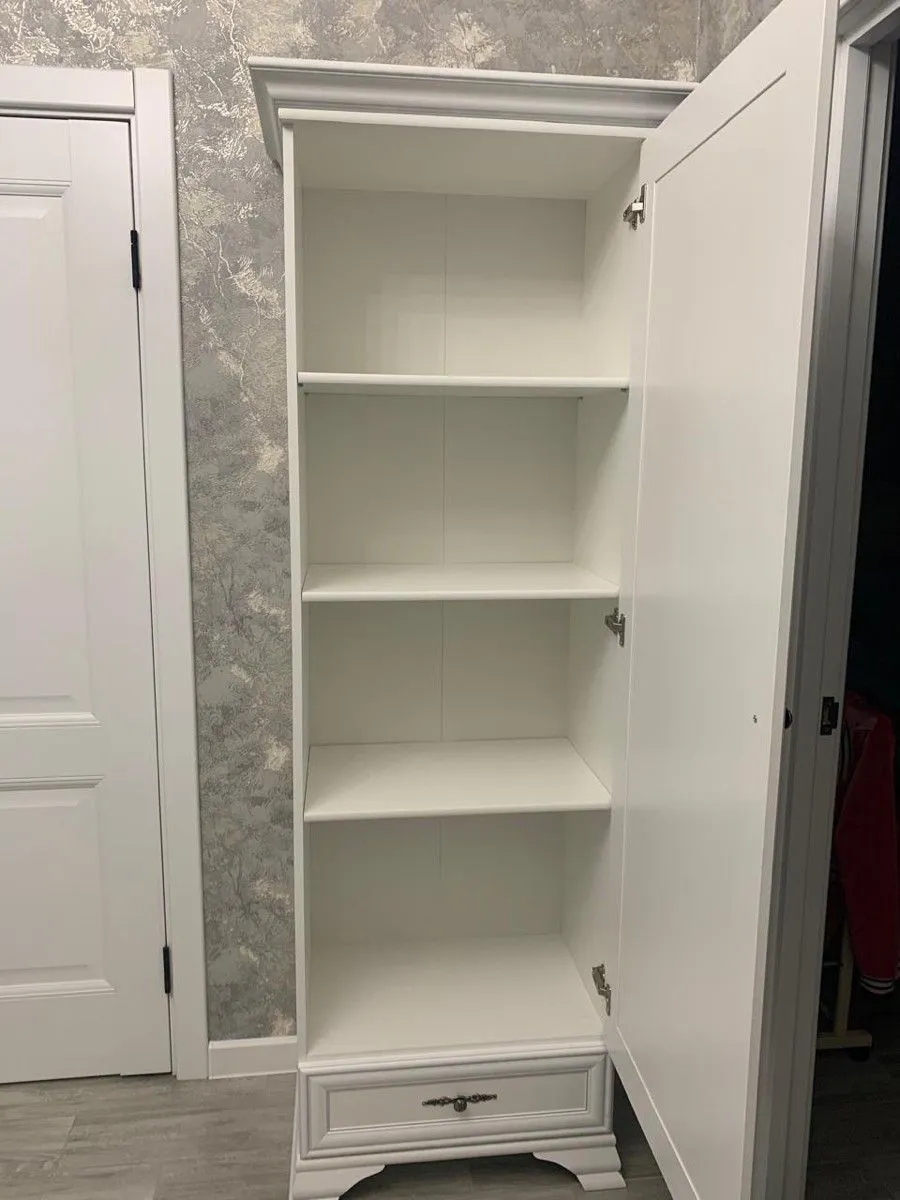 Внутри установлены четыре регулируемые по высоте полки глубиной 43,5 см. Это позволит аккуратно сложить вещи без заломов и скученности. Выдвижной ящик подойдет для хранения чулочно-носочных изделий, перчаток и шарфов. Высокий белый шкаф Kentaki можно использовать отдельно или в комбинации с другой мебелью этой коллекции (тумба, зеркало, комод).