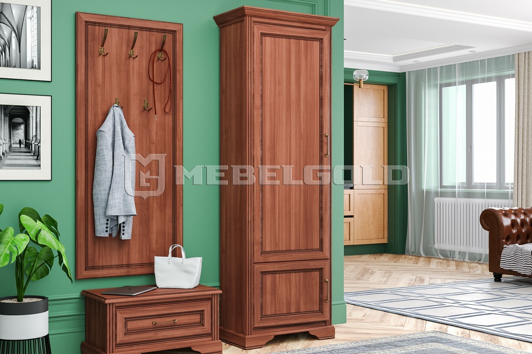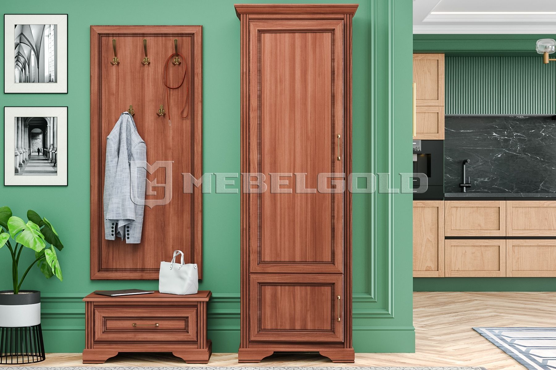 Узкий платяной шкаф Stylius со стилизованными фасадами, резными ножками и фигурным карнизом органично впишется в гостиную, прихожую, рабочий кабинет и спальню. Его цвет орех донской просто создан, чтобы дарить тепло и уют. Эта мебель классического и неоклассического стиля отлично сочетается с тумбами, комодами и другими изделиями коллекции «Стилиус».