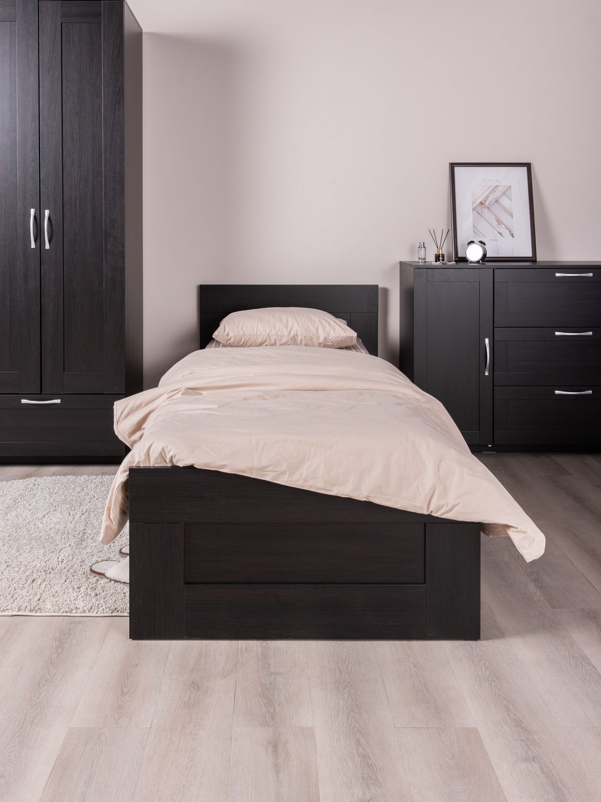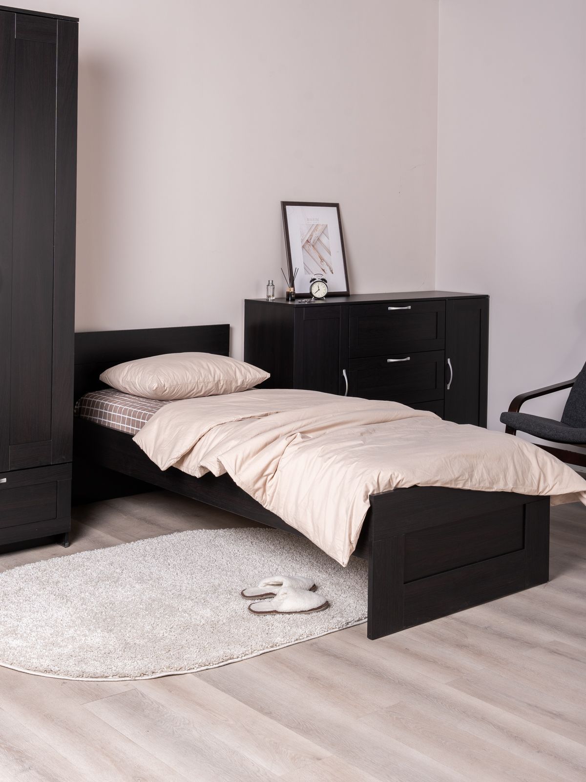 ГУД ЛАКК - знакомая мебель, которую легко купить и собрать! Односпальная кровать СИРИУС — идеальный выбор для комфортного сна и интерьера в стиле ikea.Кровать сочетает в себе простоту дизайна и практичность, а также обладает рядом преимуществ, которые сделают ваш сон более комфортным и приятным. Характеристики: Размер: 80х200 см. Материал: ДСП. Максимальная нагрузка на спальное место: 100 кг. Рекомендованная высота матраса: от 20 см и более. Высота от реечного основания до бортика: 14 см, до изножья: 18 см. Эта кровать выполнена в стиле минимализм, который никогда не выходит из моды. Она идеально впишется в любой интерьер, будь то современная квартира-студия или загородный дом. Благодаря использованию высококачественного ДСП класса экобезопасности Е0,5, эта кровать безопасна для здоровья и окружающей среды. А лаконичный дизайн без лишних деталей позволит вам наслаждаться спокойным и крепким сном. Кровать СИРИУС оснащена реечным основанием, которое обеспечивает хорошую циркуляцию воздуха и способствует правильному распределению нагрузки на позвоночник. Кроме того, она имеет высоту от пола до реечного основания 14 см, что обеспечивает удобство при посадке и вставании. Обратите внимание, что матрас не входит в комплект поставки. Если вы предпочитаете хранить вещи под кроватью, то обратите внимание на то, что выкатные ящики не входят в комплектацию кровати СИРИУС. Вы можете приобрести их отдельно, чтобы максимально использовать пространство под кроватью. Ящик выкатной для кроватей СИРИУС и ОРИОН, 60х60х20 см, черно-коричневый, дуб венге, код товара 817251994Ящик выкатной для кроватей СИРИУС и ОРИОН, 138х60х20 см, черно-коричневый, дуб венге код товара 817252024Ключевые особенности: Материал: ДСП. Стиль: минимализм. Экологичность: класс экобезопасности ДСП Е0,5.Комплектация: без матраса и выкатных ящиков. Односпальная кровать СИРИУС станет отличным выбором для тех, кто ценит комфорт, практичность и стиль. Она подарит вам спокойный и крепкий сон, а также станет стильным дополнением к вашему интерьеру.