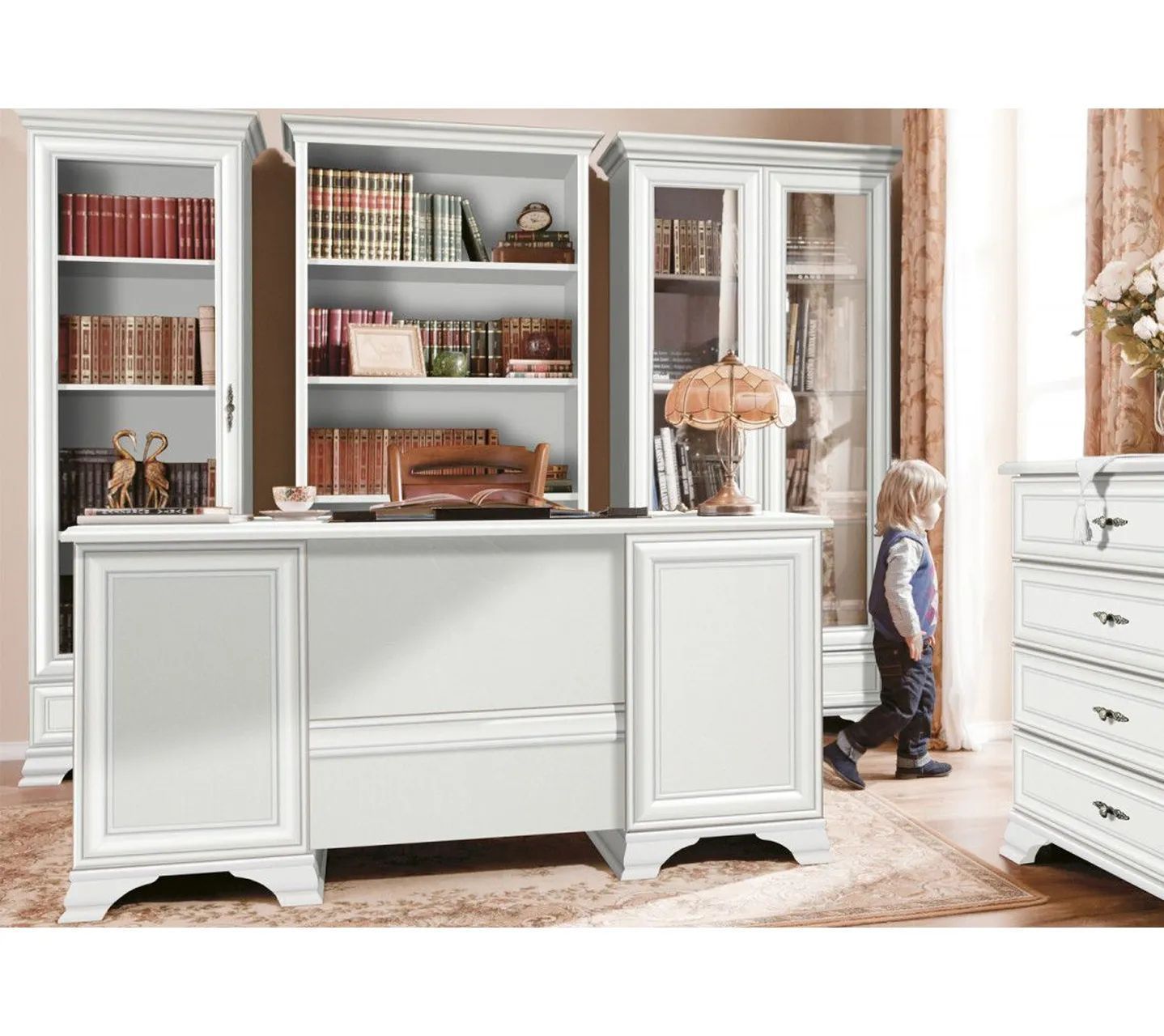 Фасады такой мебели украшены филенками и элегантными металлическими ручками. Устойчивость конструкции придают широкие, массивные ножки. Белый письменный стол серии Kentaki – отличный вариант для обустройства учебной и рабочей зоны. Он отлично вписывается в интерьер аналогичной стилистики и цветовой гаммы.