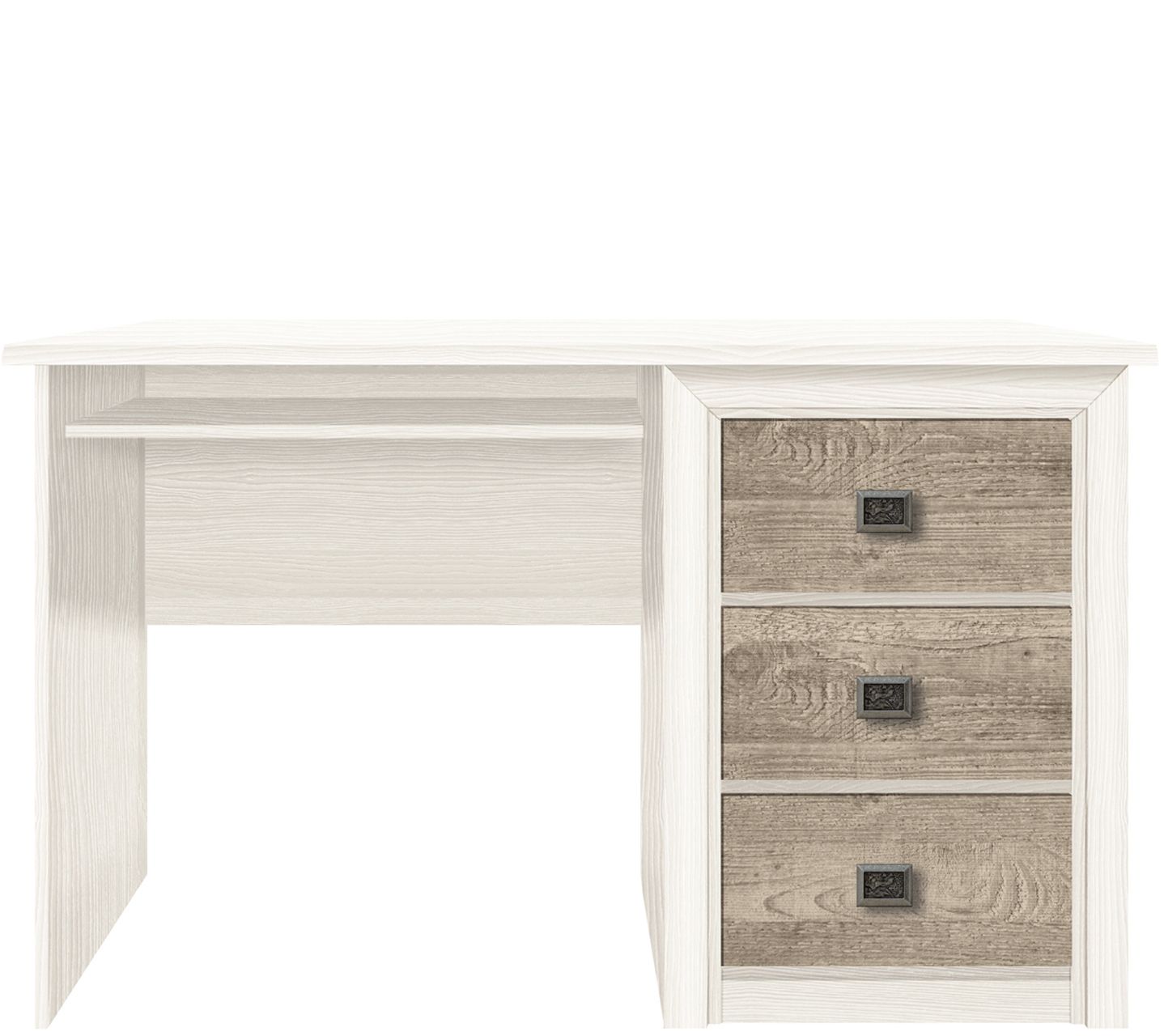 Письменный стол в цвете снежного ясеня Koen гармонично сочетается с коричневыми вставками на ящиках. Подчеркнуто статусный вид им придают квадратные ручки с гравировкой. Еще больше плюсов имеет столешница, ее матовая поверхность не создает бликов и легко очищается от любых загрязнений. Добавьте к письменному столу «Коэн» полку из этой коллекции и получите полностью благоустроенную рабочую зону.