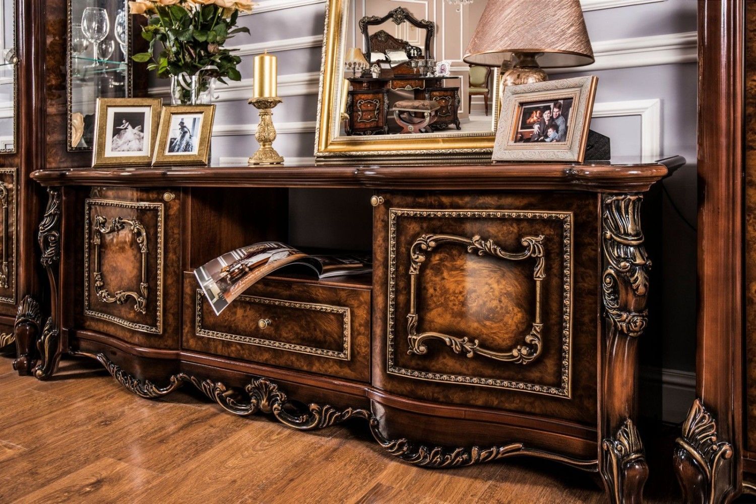 Элегантные фасады ТВ тумбы «Джоконда» в благородном цвете корень дуба приковывают внимание золочеными узорами и симметричным расположением декора. Красивый глянцевый отлив добавляет еще большей выразительности и делает ярким предметом интерьера. По-настоящему аристократичный вид и визуальную легкость этой модели придают изогнутые ножки. На темном фоне сверкающая позолота выглядит дорого и смело.