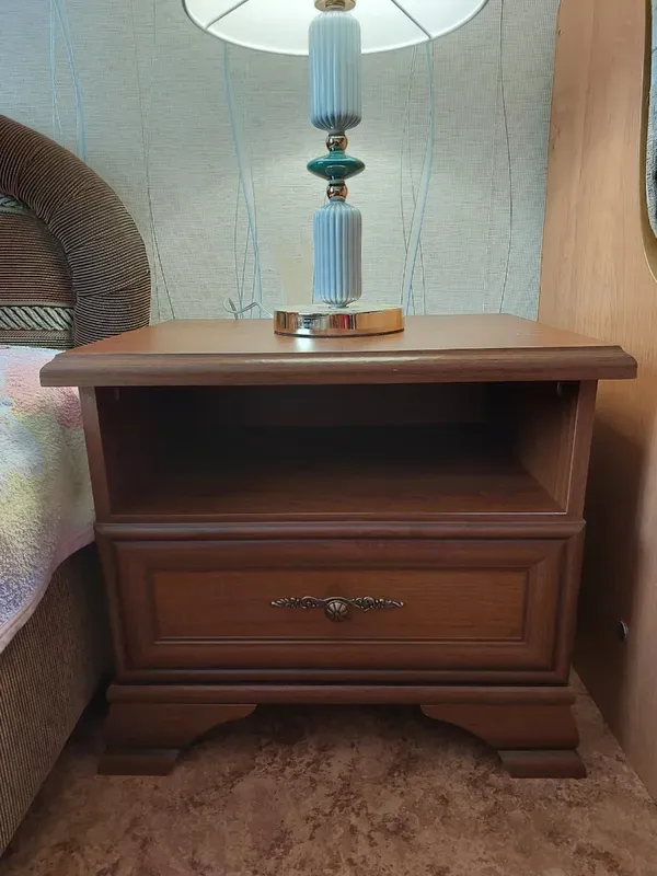 Прикроватная тумба каштановго цвета Kentaki – это классическая конструкция на ножках с открытым отделением и выдвижным ящиком на роликовых направляющих. Небольшая по высоте модель (47 см) прямоугольной формы и ширины 55 см идеально встанет вровень с кроватью и создаст привычные удобства. Установите ее на уровне вытянутой руки и пользуйтесь, не вставая с постели.