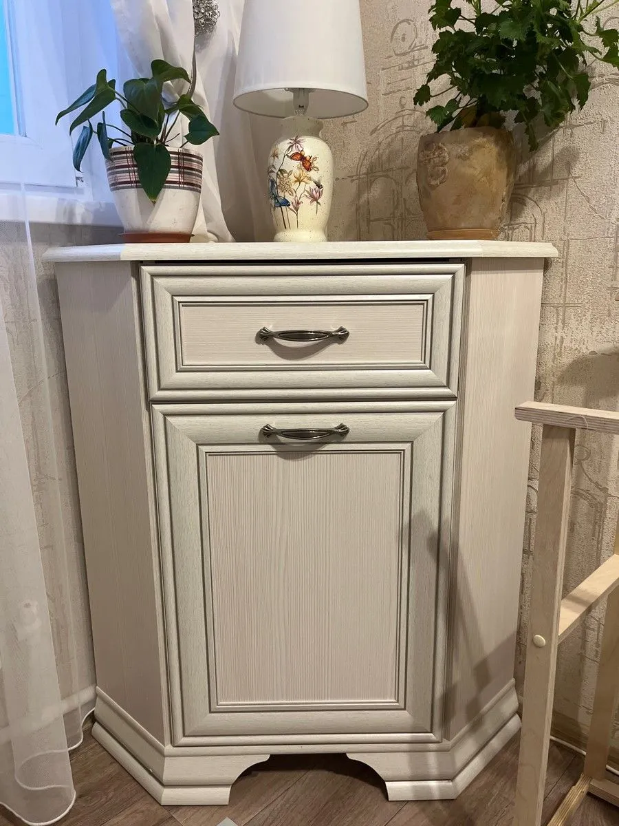 Удобный угловой шкафчик. Цвет для меня оказался не очень подходящим. Как будто оклеено бумагой. Пришлось покрасить. К этой тумбе покупала угловой подвесной шкафчик . Смотрится как витрина.