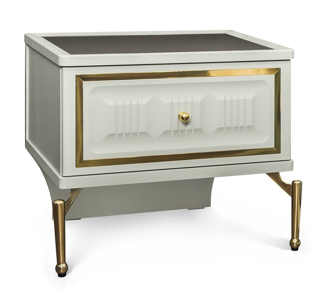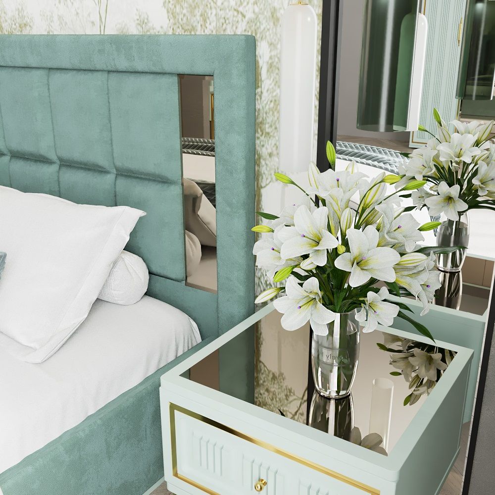 Прикроватные тумбочки с эффектом парения, туалетный стол на лёгких металлических опорах с топами из крашеного итальянской эмалью МДФ с модным декором стеклянной бронзированной поверхностью выгодно подчеркнут стиль спальни. Спальня оснащена современными европейскими механизмами с доводчиками.