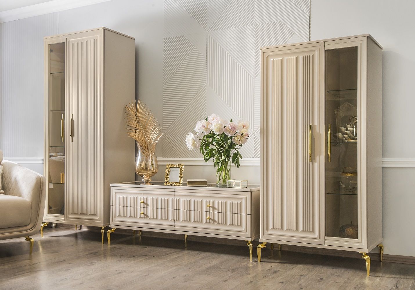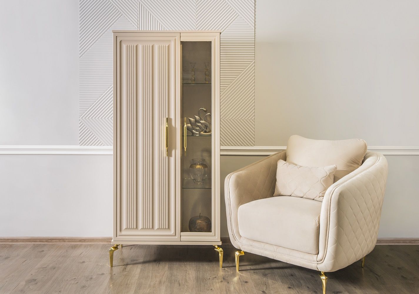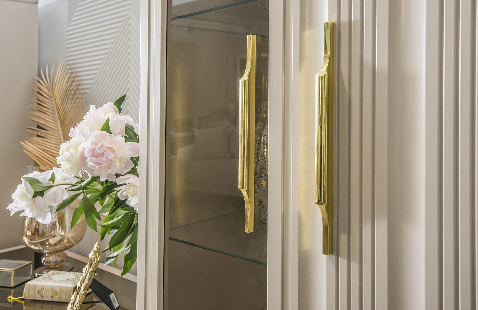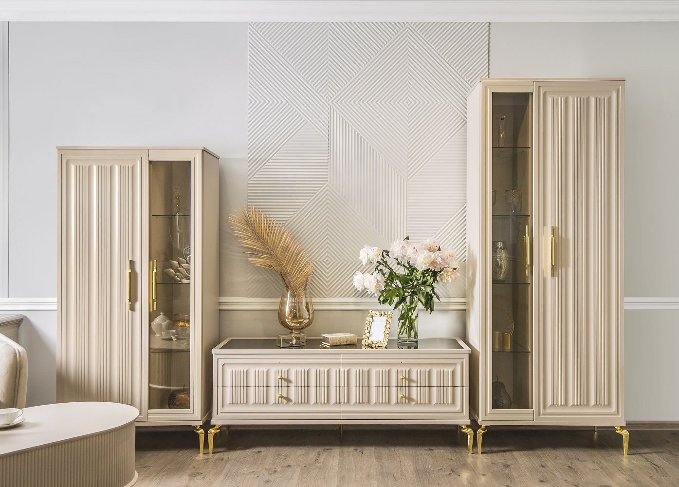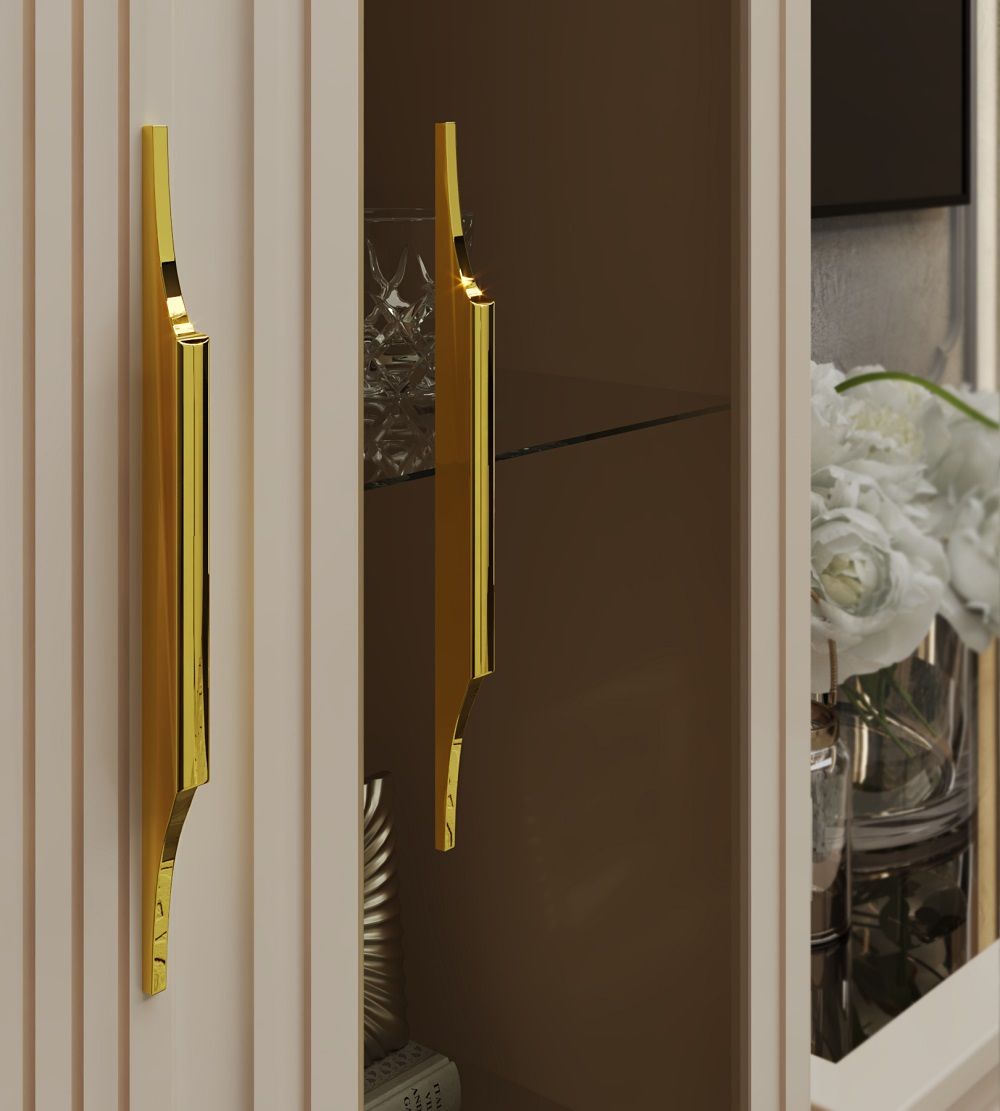 ФасадМДФ с фрезеровкой и вставкой из пластика под латунь/хром + стеклянная дверь с фрезеровкой МДФ;