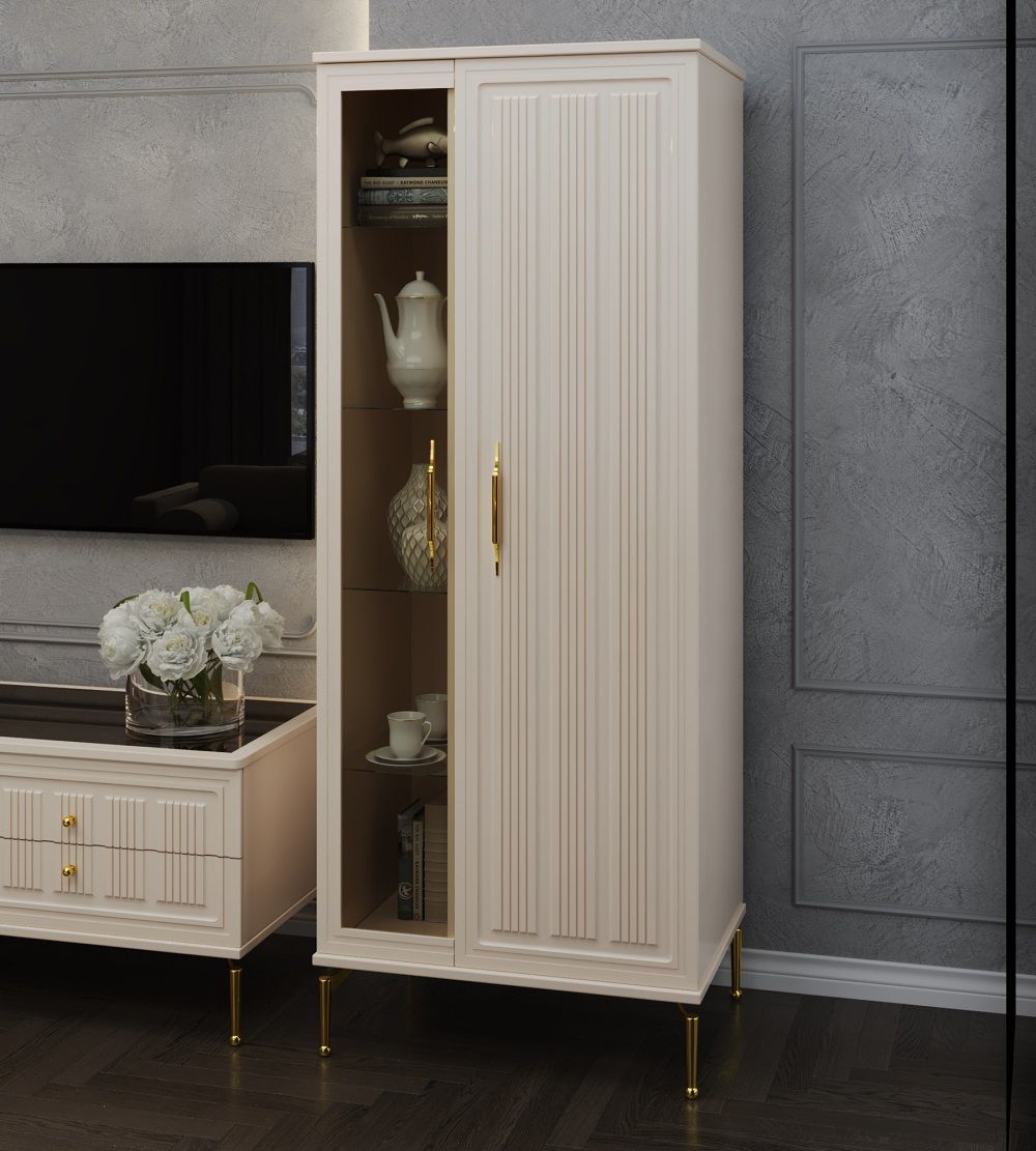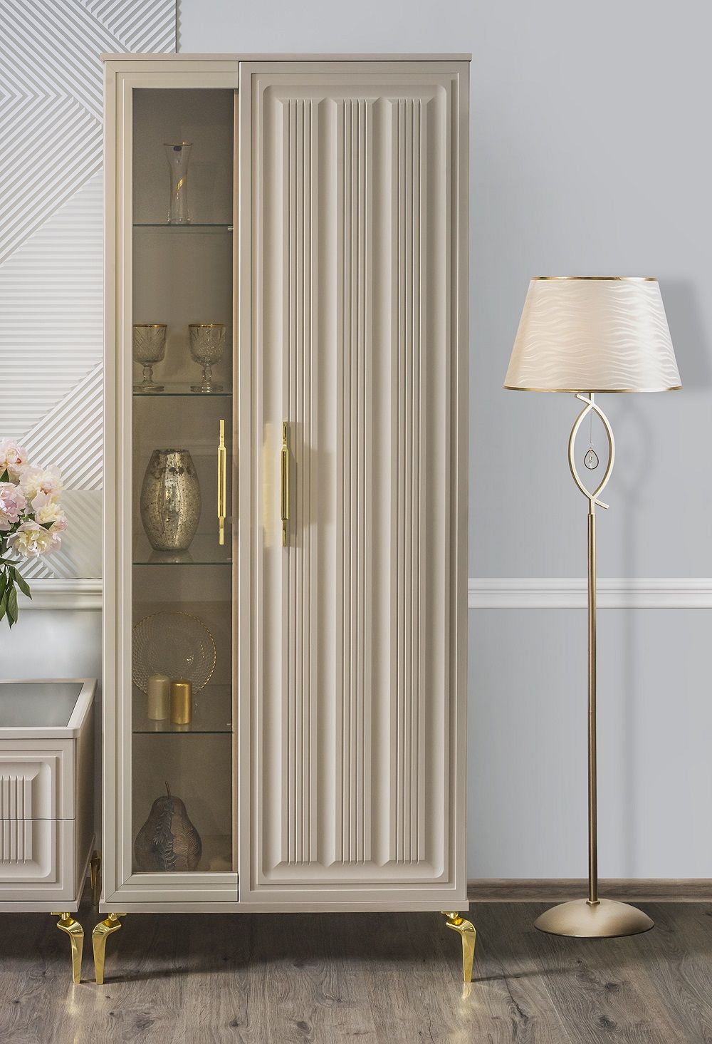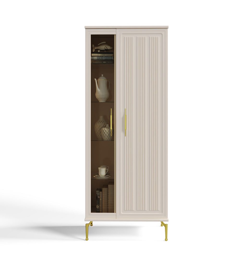 Внутреннее наполнениеШкаф разделен на 2 секции: за щитовой дверью – 4 щитовые полки, за дверью со стеклом – 4 стеклянные полки;