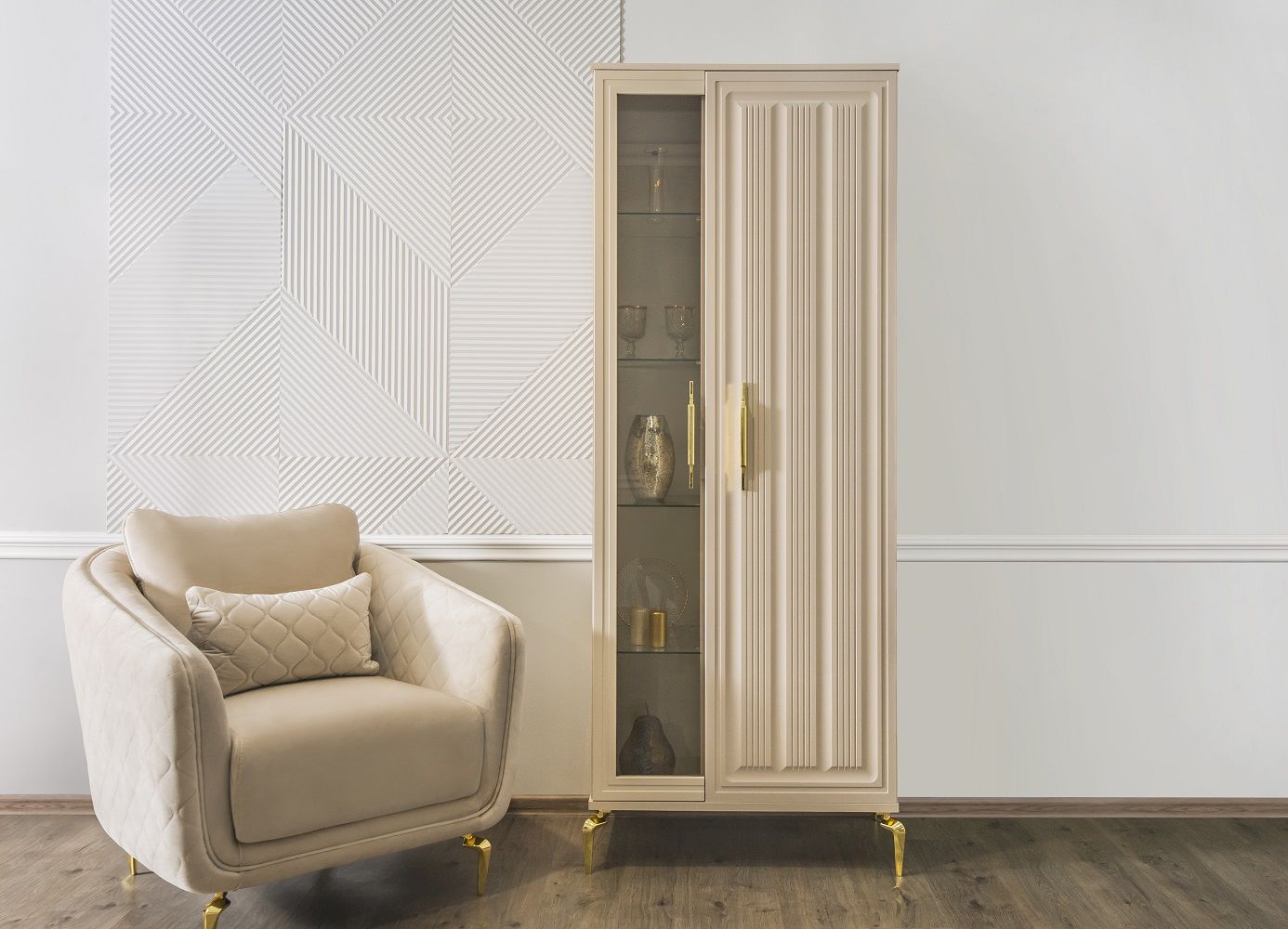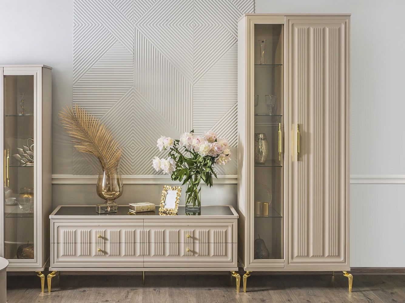 ФасадМДФ с фрезеровкой и вставкой из пластика под латунь/хром + стеклянная дверь с фрезеровкой МДФ;